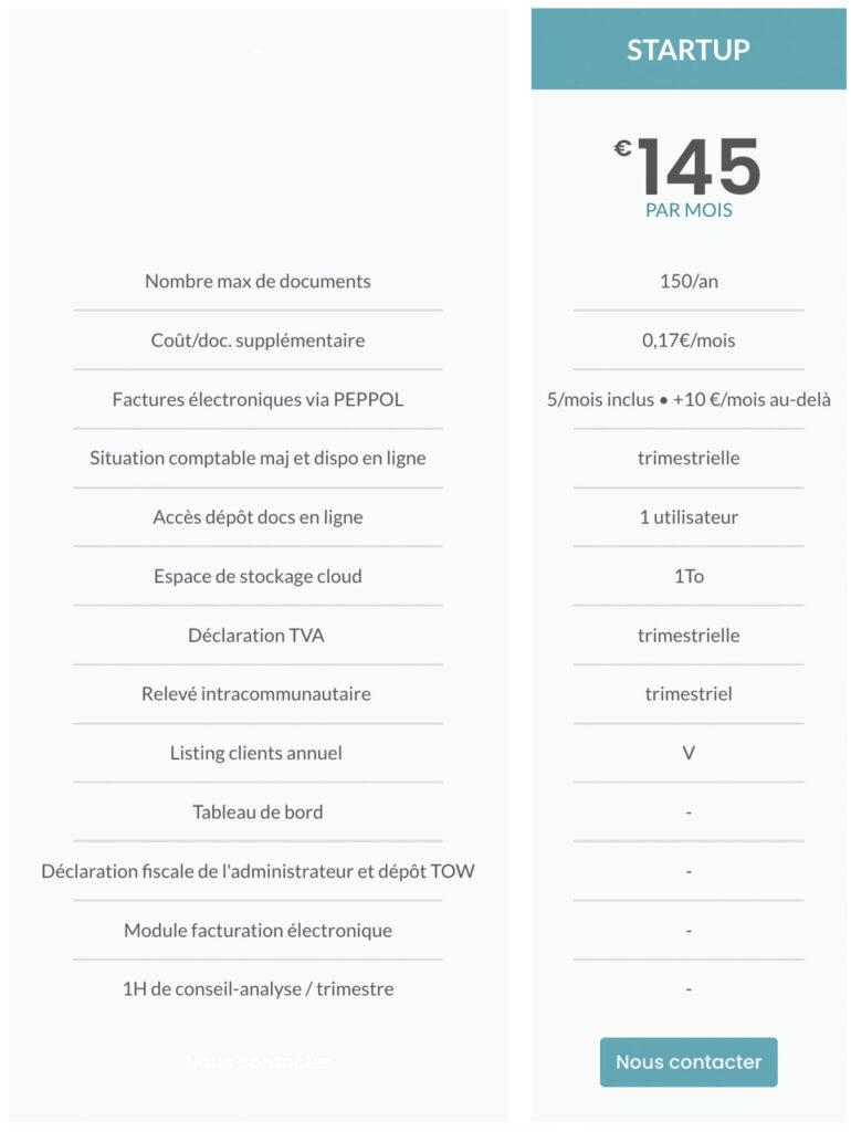 Chaque forfait inclut un volume annuel de documents comptables (300, 450 ou 800 selon la formule). En cas de dépassement, un coût unique de 0,17 € HTVA par document et par mois est appliqué, quel que soit le forfait choisi.